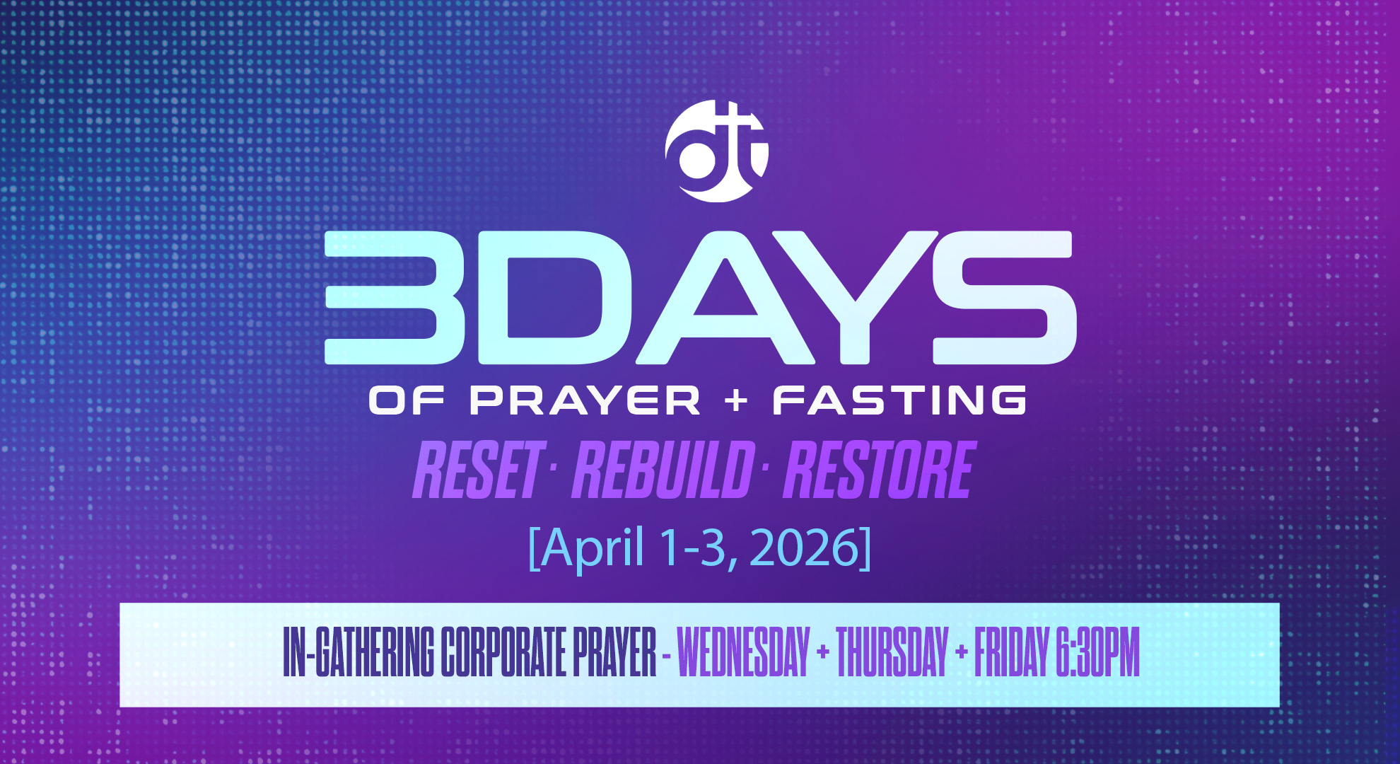 We warmly invite you to join us for a transformative 3-day journey of Prayer and Fasting, themed “Reset, Rebuild, Restore.” This spiritual gathering will take place from April 1st to April 3rd, offering a sacred time to reflect, renew, and reconnect with our faith and purpose.